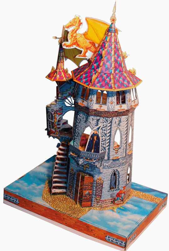 | | Proponujemy Państwu model 3D „Wieża Księżniczki". Zabawka jest interesująca zarówno w procesie składania, jak również jako zestaw zabawowy. Dzieci w wieku od 5 do 7 lat powinny składać model razem z rodzicami, dzieci w wieku od 7 do 10 lat mogą same złożyć konstruktor według instrukcji papierowej lub wideo. Dany model wykonywany jest w różnych wariantach: „Wieża Księżniczek" oraz „Wieża Czarownika". Modele różnią się designem i ilością bohaterów. Zestaw zabawowy składa się z wieży z trzema kondygnacjami mieszkalnymy, schodami kręconymi, wieżyczką i balkonem. Ilość bohaterów zależy od konkretnego zestawu, ale ci się nie zmieniają: księżniczka, książę na białym koniu, król, królowa i zły smok. W zestawie jest również komplet tekturowych mebli. Ilość i jakość bohaterów pozwala na fascynującą zabawę. Model „Wieża Księżniczki" produkowany jest w dwóch rozmiarach: mały - 195x120x385 mm i duży - 275x165x500 mm. Wieża oraz konstrukcje nośne wykonane są z tektury introligatorskiej 1 mm z pełnokolorowym nadrukiem. Figurki również wykonane są z tektury introligatorskiej o grubości 305 g/m.