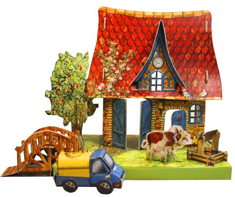 Model „Ferma" istnieje tylko jako makieta, nie był jeszcze produkowany. Jest to pierwszy model z serii „Country". Seria ta zawiera modele (zestawy zabawowe) „Młyn" oraz „Domek farmera", planujemy jeszcze zaprojektowanie zestawu „Traktory". Seria „Country" jest stworzona przede wszystkim po to, by pomóc dzieciom z miasta zrozumieć, czym jest gospodarstwo wiejskie, jak robi się chleb i mleko. Dziecko może poczuć się gospodarzem ziemi, uprawiać pole, siać i hodować rośliny.Modele zapakowane są w pudełko, na którym później są składane. Wymiary modelu: 265x145x190 mm. W komplecie jest dom, drzewo, most, trzy krowy, samochód - cysterna z mlekiem, babcia - dojarka.